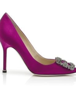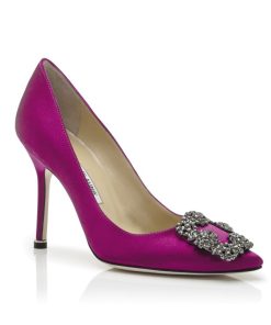 Fuchsia satin almond toe pumps featuring a square crystal buckle encased in a gunmetal frame. Finished with a stiletto high heel. Upper: 68% viscose, 32% silk. Sole: 100% cow leather. Lining: 100% kid leather. Heel measures 105 mm. Italian sizing. Made in Italy.