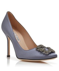 Grey satin almond toe pumps featuring a square crystal buckle encased in a gunmetal frame. Finished with a stiletto high heel. Upper: 68% viscose, 32% silk. Sole: 100% cow leather. Lining: 100% kid leather. Heel measures 105 mm. Italian sizing. Made in Italy.