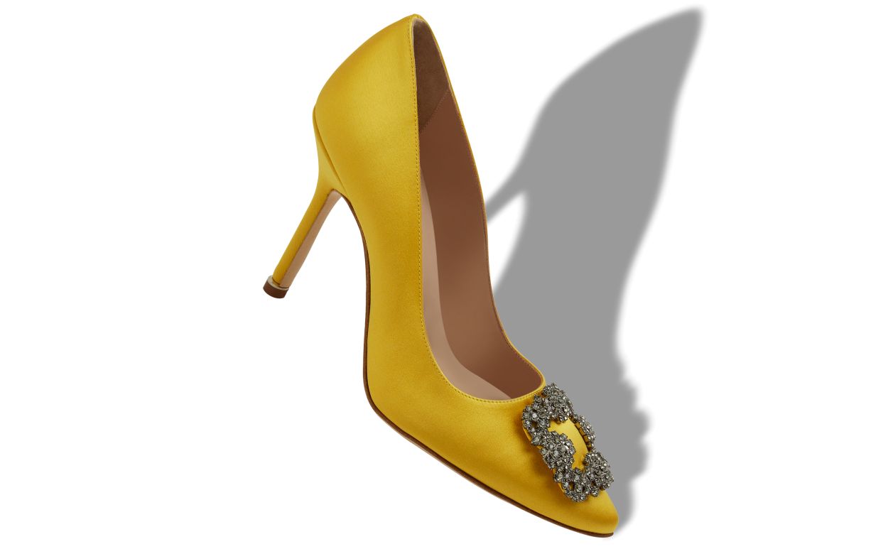 Yellow satin almond toe pumps featuring a square crystal buckle encased in a gunmetal frame. Finished with a stiletto high heel. Upper: 68% viscose, 32% silk. Sole: 100% cow leather. Lining: 100% kid leather. Heel measures 105 mm. Italian sizing. Made in Italy.