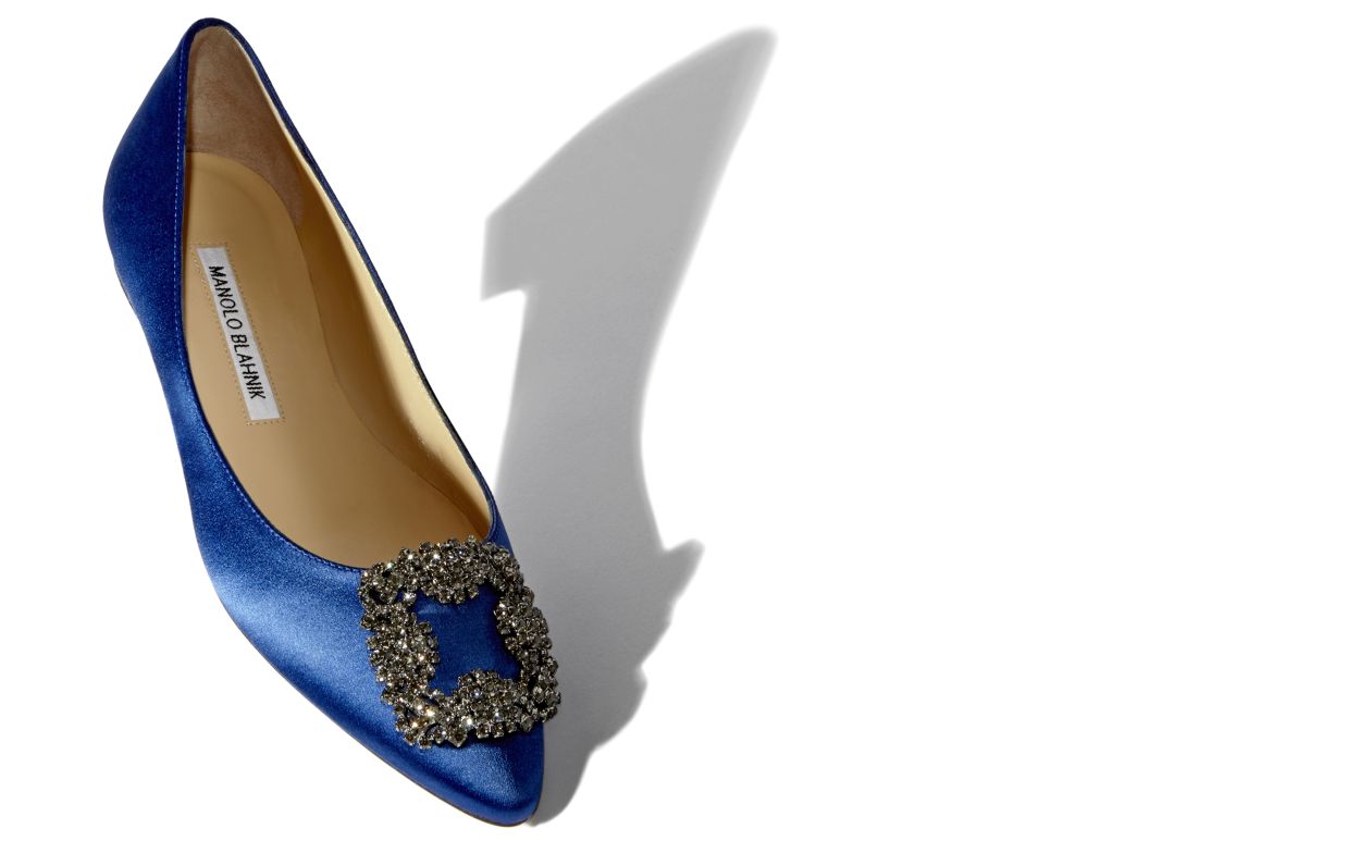 Blue satin almond toe flat pumps finished with a square crystal buckle encased in a gunmetal frame. Upper: 68% viscose, 32% silk. Sole: 100% cow leather. Lining: 100% kid leather. Heel measures 10 mm. Italian sizing. Made in Italy.