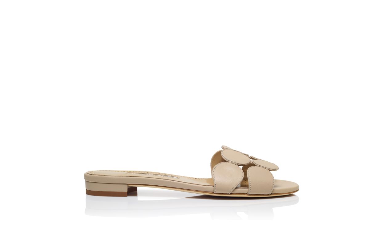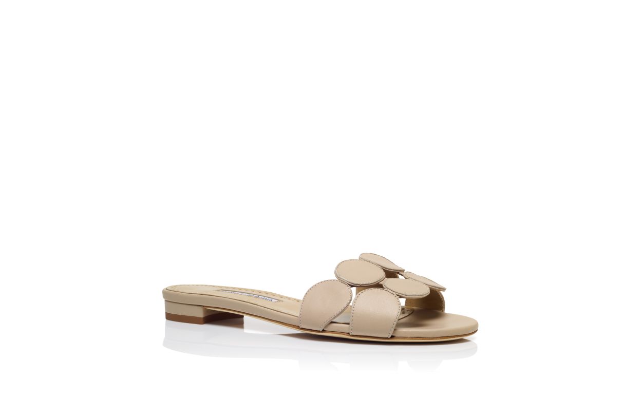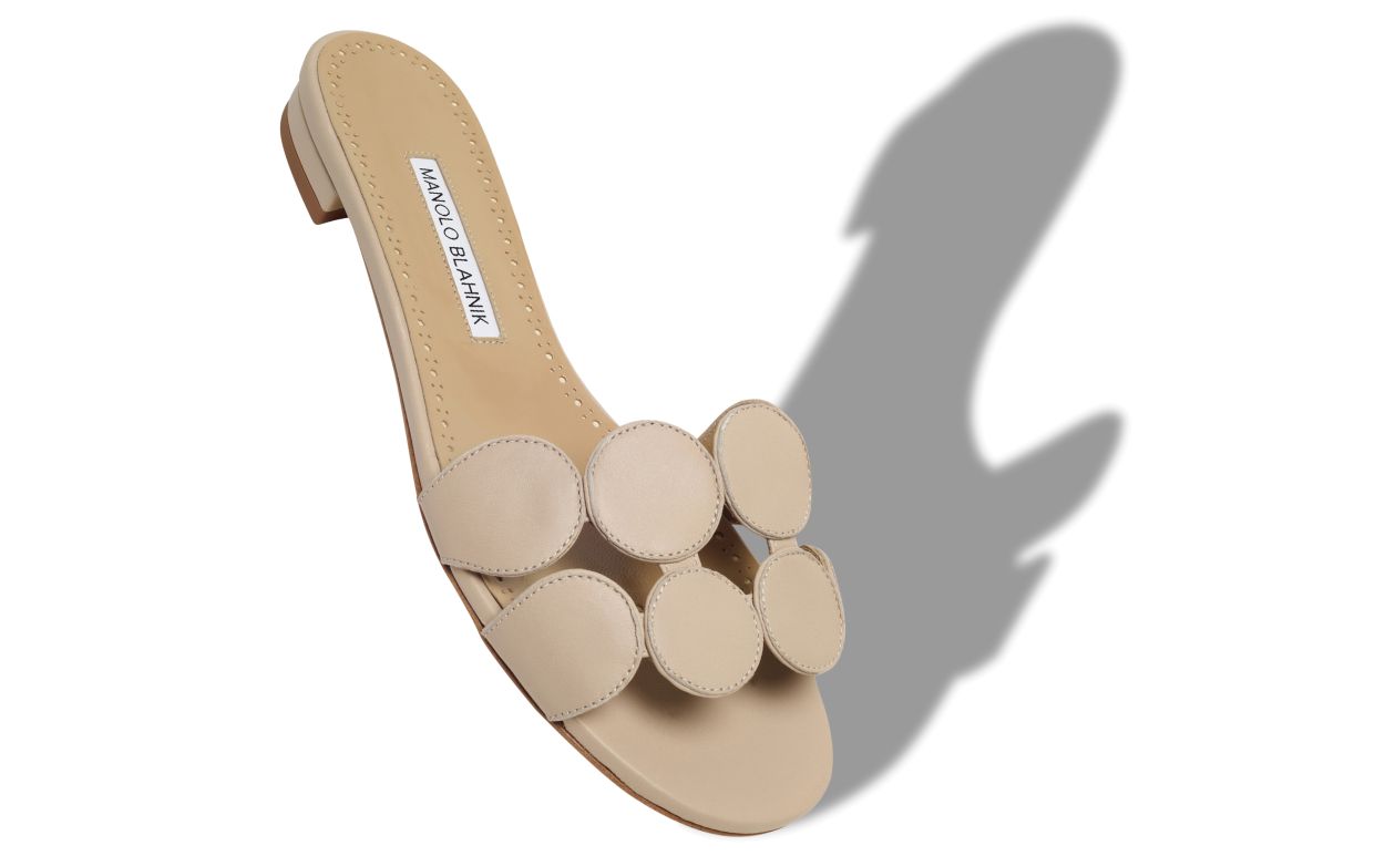 Beige nappa leather open toe flat sandals featuring circular geometric strap and flat stacked heel. Upper: 100% lamb nappa. Sole: 100% calf leather. Lining: 100% kid leather. Heel measures 10 mm. Italian sizing. Made in Italy.