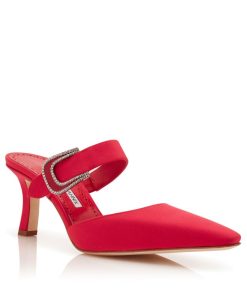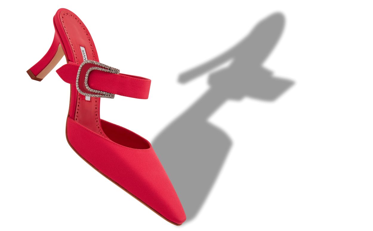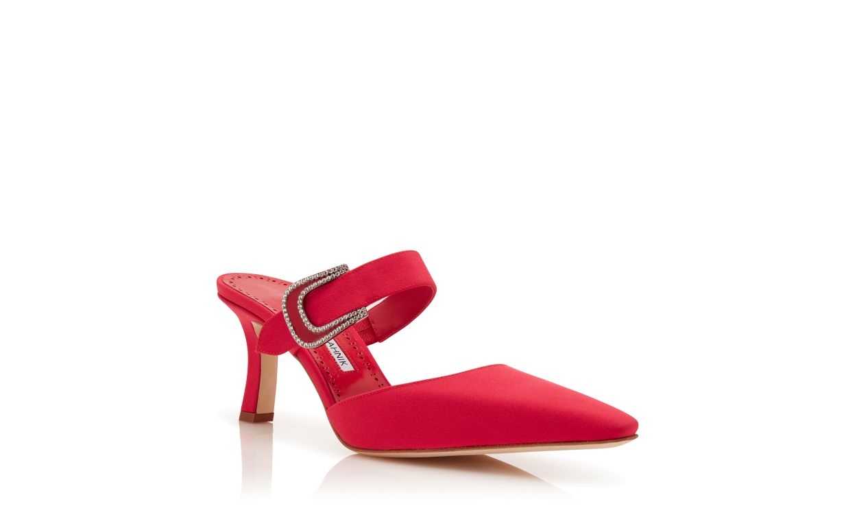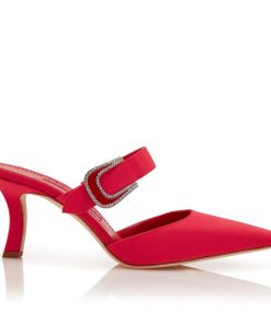 Red crepe de chine pointed toe mules featuring instep strap with jewel buckle detail and flared block mid heel.Upper: 100% silk. Sole: 100% calf leather. Lining: 100% kid leather. Heel measures 70 mm. Italian sizing. Made in Italy.