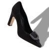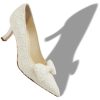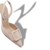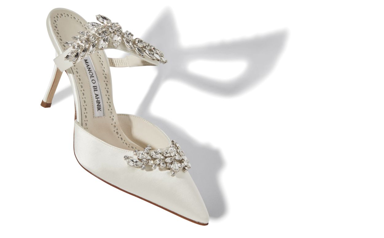 Off-white satin mules featuring pointed toe, front strap with crystal embellishment and stiletto high heel. Upper: 68% viscose, 32% silk. Sole: 100% cow leather. Lining: 100% goat skin. Heel measures 90 mm. Made in Italy.