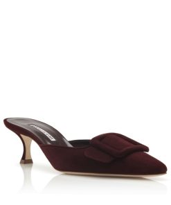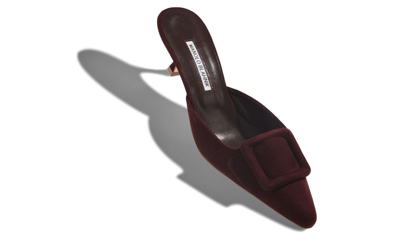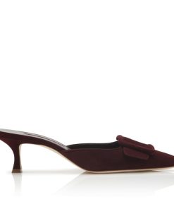 Burgundy suede mules featuring suede buckle and kitten heel. Upper: 100% kid suede. Sole: 100% calf leather. Lining: 100% kid leather. Heel measures 50 mm. Italian sizing. Made in Italy.