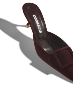 Burgundy suede mules featuring suede buckle and kitten heel. Upper: 100% kid suede. Sole: 100% calf leather. Lining: 100% kid leather. Heel measures 50 mm. Italian sizing. Made in Italy.