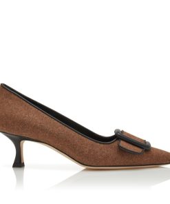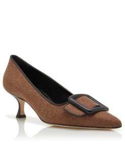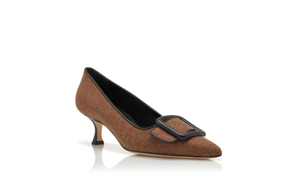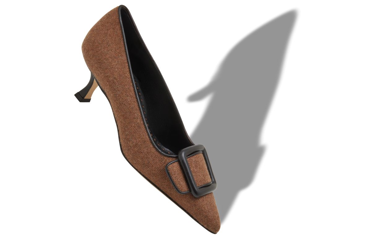Brown wool pointed toe pumps featuring black calf leather edging and decorative buckle. Finished with stiletto low heel.