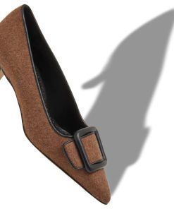 Brown wool pointed toe pumps featuring black calf leather edging and decorative buckle. Finished with stiletto low heel.