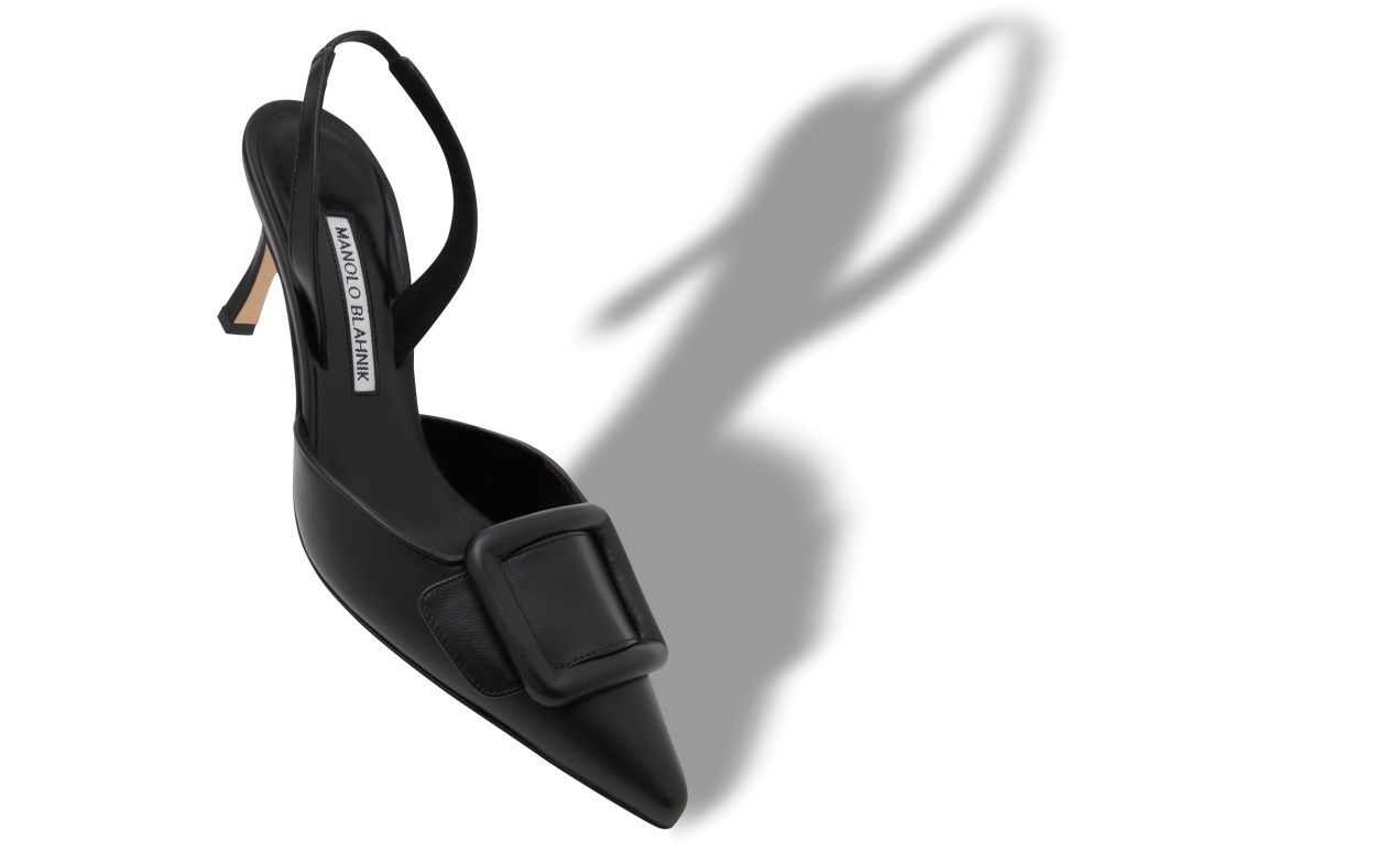 Black nappa leather pointed toe slingback pumps featuring decorative buckle detail, elasticated slingback strap and stiletto mid heel. Upper: 100% lamb nappa. Sole: 100% calf leather. Lining: 100% kid leather. Heel measures 70 mm. Italian sizing. Made in Italy.