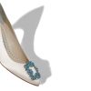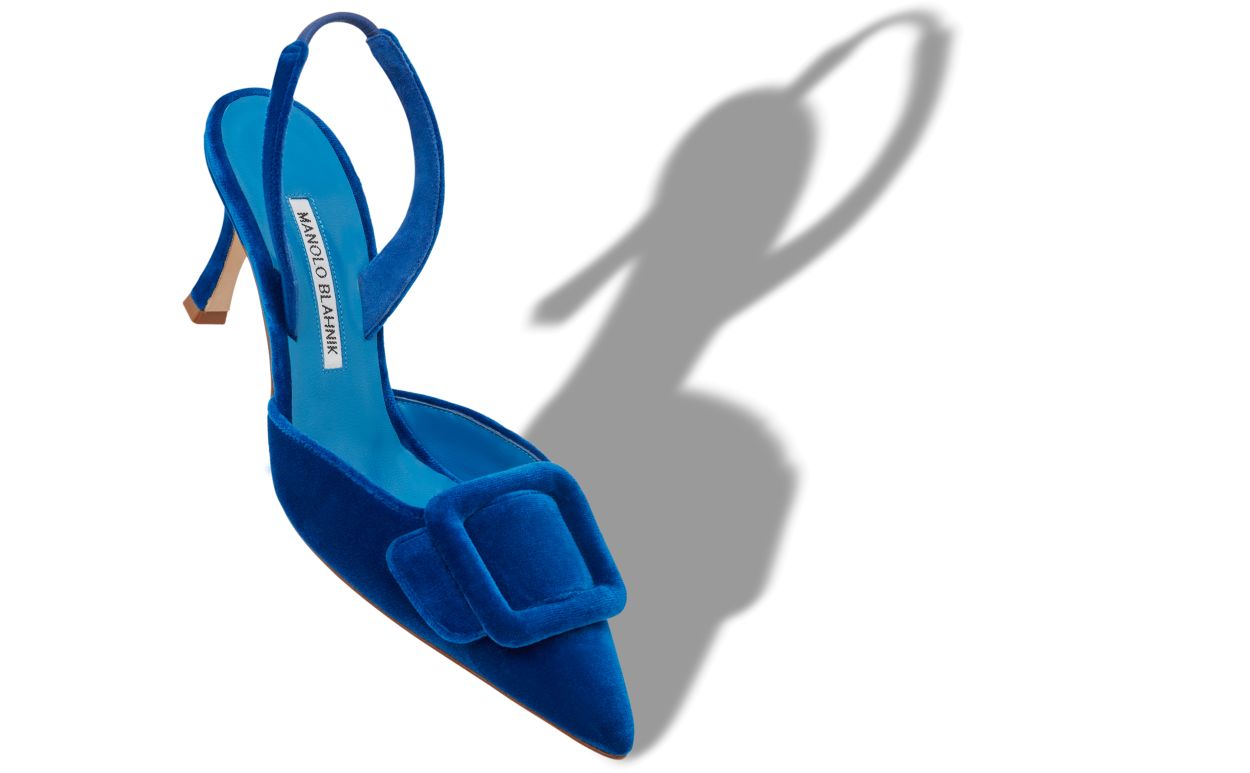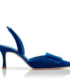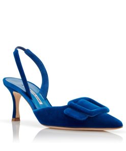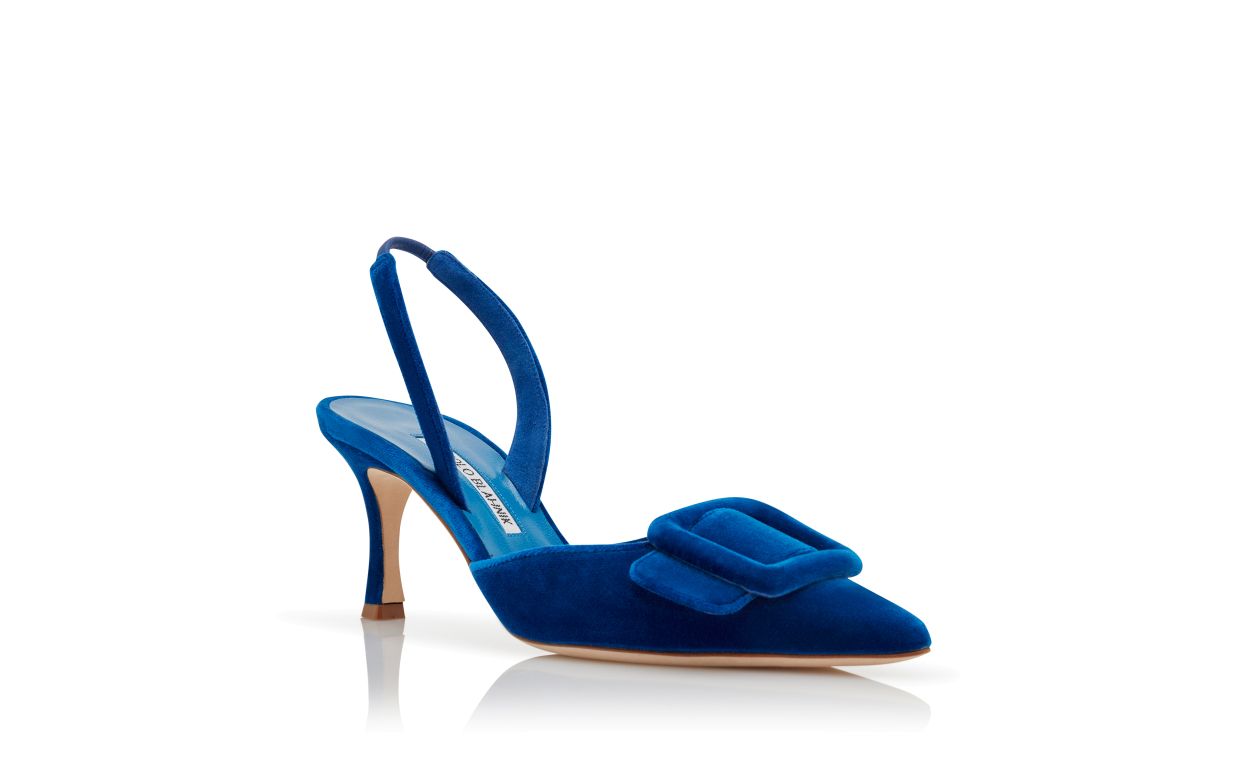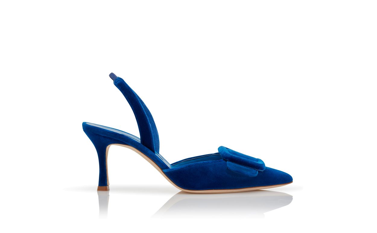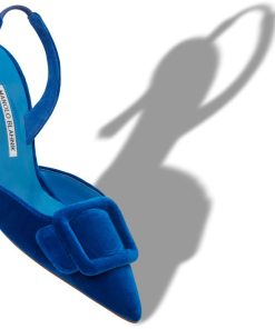 Blue velvet slingback pointed toe pumps featuring decorative buckle detail, elasticated strap and stiletto mid heel.Upper: 100% velvet. Sole: 100% calf leather. Lining: 100% kid leather.Heel measures 70 mm.Italian sizing.Made in Italy.