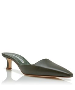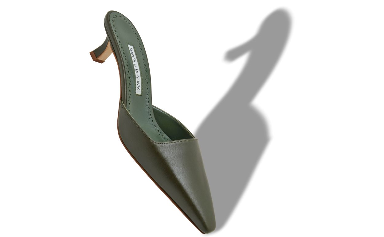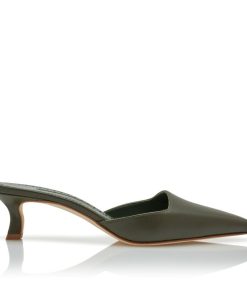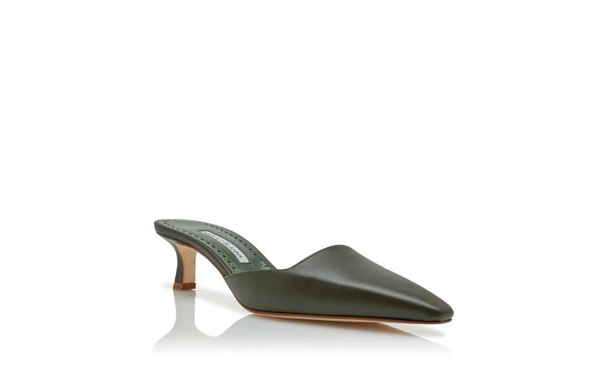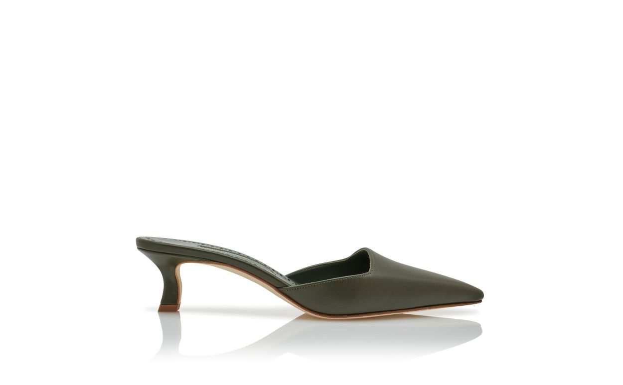 Dark green nappa leather pointed toe mules featuring square cut design and flared block low heel.Upper: 100% lamb nappa. Sole: 100% calf leather. Lining: 100% kid leather. Heel measures 50 mm. Italian sizing. Made in Italy.