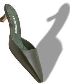 Dark green nappa leather pointed toe mules featuring square cut design and flared block low heel.Upper: 100% lamb nappa. Sole: 100% calf leather. Lining: 100% kid leather. Heel measures 50 mm. Italian sizing. Made in Italy.