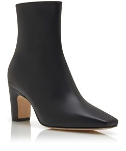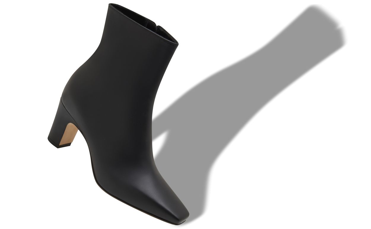 Black calf leather pointed toe ankle boots featuring side zip closure and block mid heel.