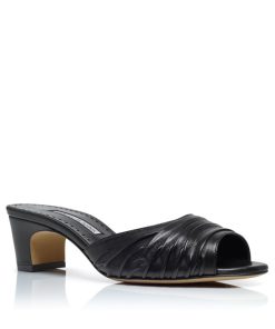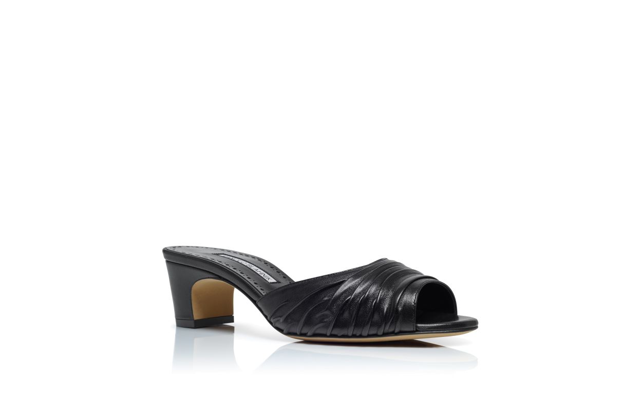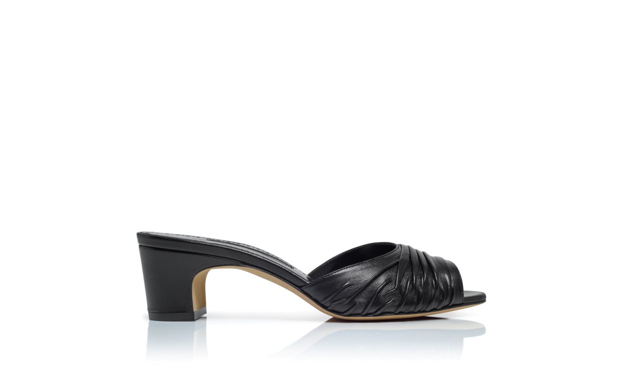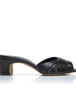 Black nappa leather open toe mules featuring ruched details and low block heel.Upper: 100% lamb nappa. Sole: 100% calf leather. Lining: 100% kid leather.Heel measures 50 mm.Italian sizing.Made in Italy.