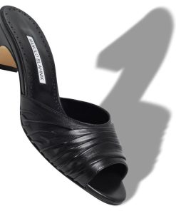 Black nappa leather open toe mules featuring ruched details and low block heel.Upper: 100% lamb nappa. Sole: 100% calf leather. Lining: 100% kid leather.Heel measures 50 mm.Italian sizing.Made in Italy.