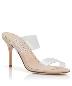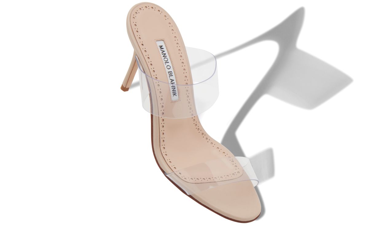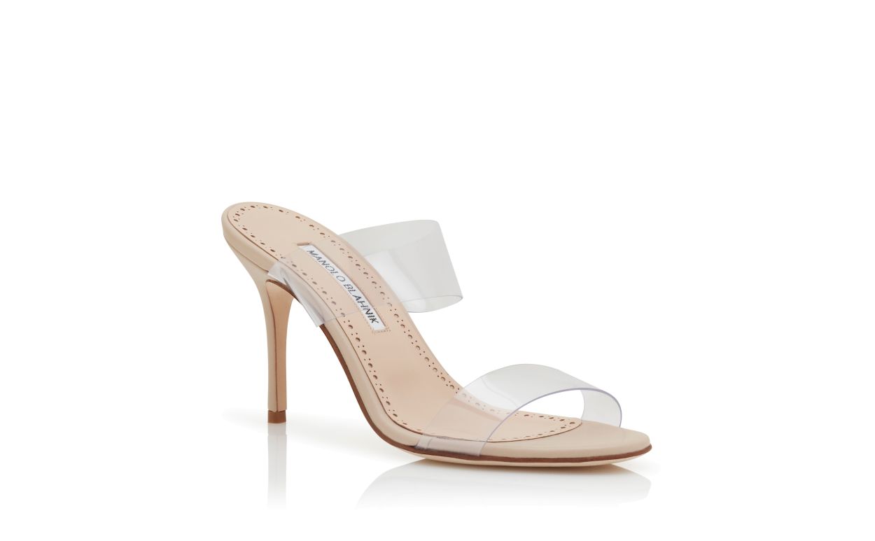 Light beige mules featuring open toe design, two front clear PVC straps and a beige leather stiletto high heel. Upper: 100% PVC. Sole: 100% cow leather. Lining: 100% goat skin. Heel measures 90 mm. Italian sizing. Made in Italy.