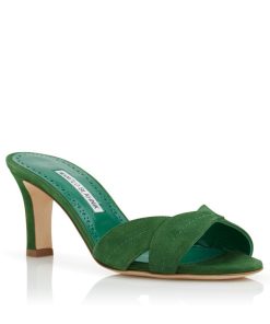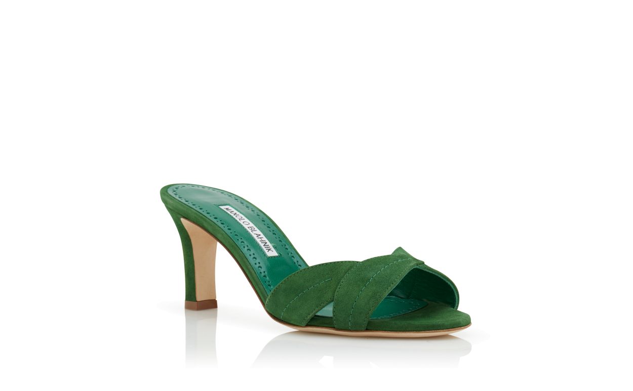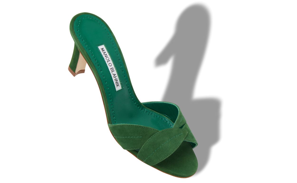 Green suede open toe mules featuring leaf-shaped design with top stitch detail and mid block heel. Upper: 100% kid suede. Sole: 100% calf leather. Lining: 100% goat skin.Heel measures 70 mm.Italian sizing.Made in Italy.