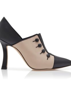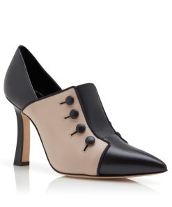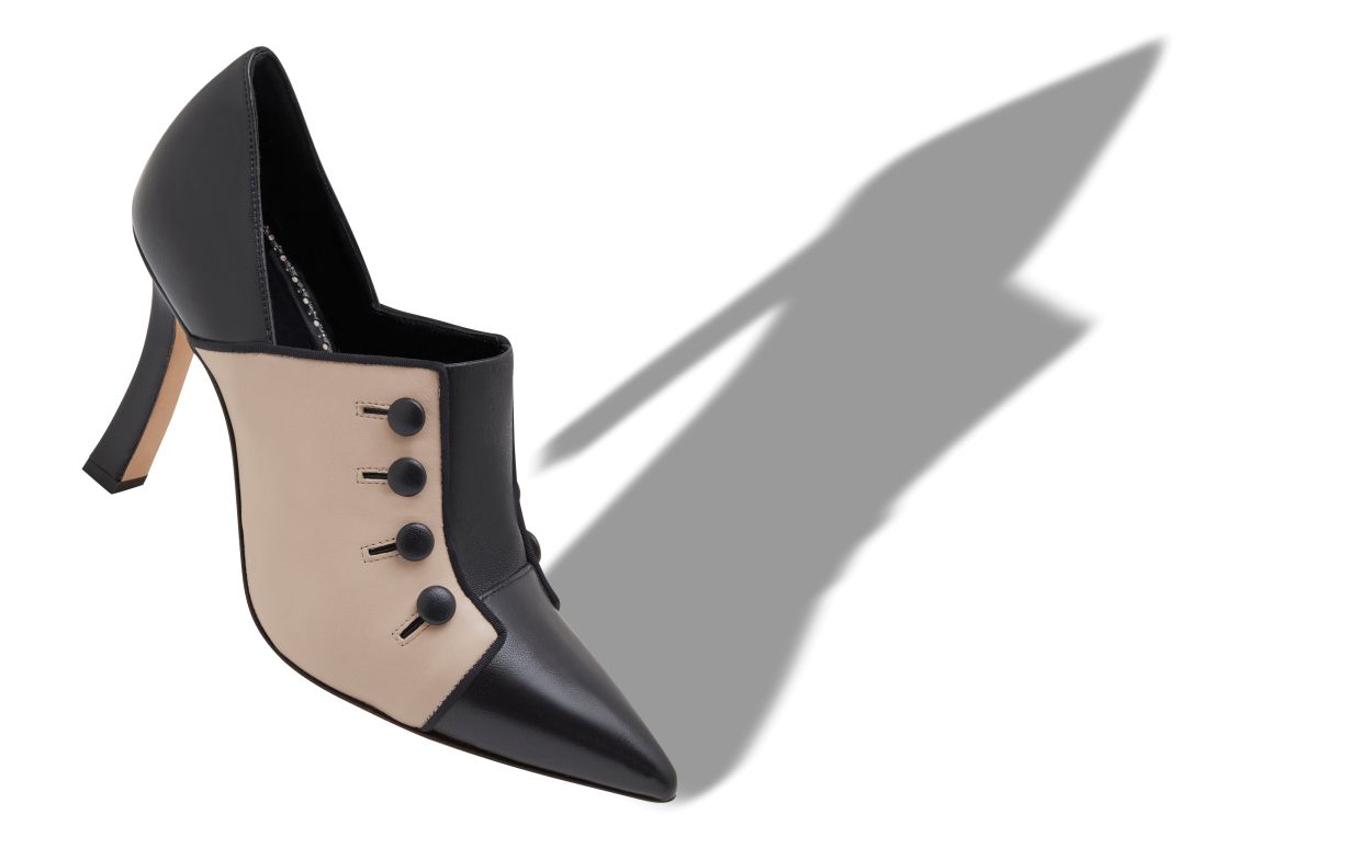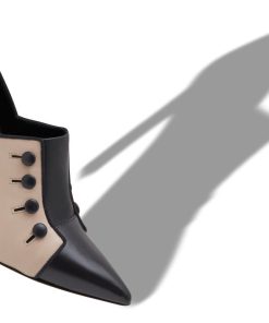 Beige nappa leather pointed toe shoe booties featuring black toe cap, counter and edging. Finished with decorative buttonhole design with buttons and flared block high heel.Upper: 100% lamb nappa. Sole: 100% calf leather. Lining: 100% kid leather. Heel measures 105 mm. Italian sizing. Made in Italy.
