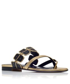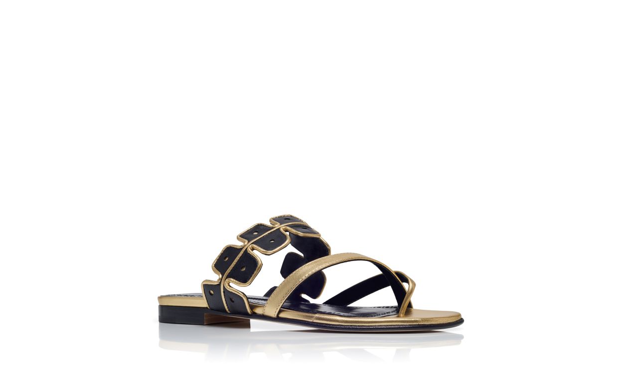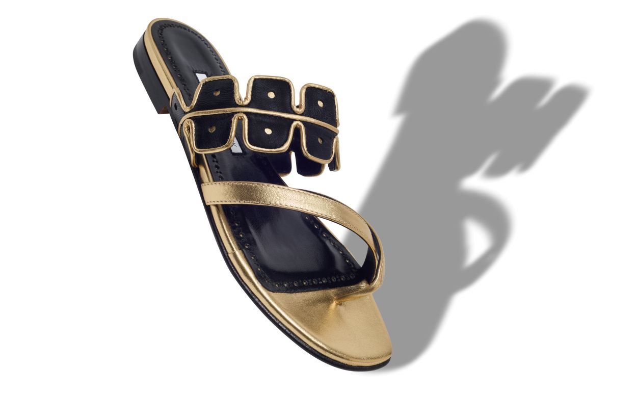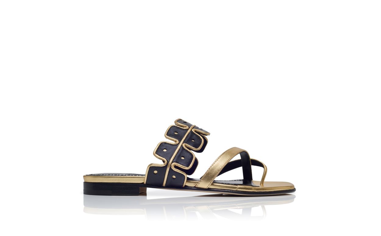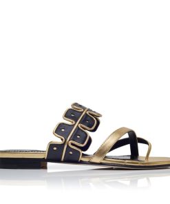 Gold nappa leather open toe flat sandals featuring black scalloped instep strap with bronze edging and crossover front straps with toe stem. Finished with flat stacked heel.