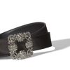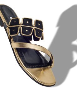 Gold nappa leather open toe flat sandals featuring black scalloped instep strap with bronze edging and crossover front straps with toe stem. Finished with flat stacked heel.