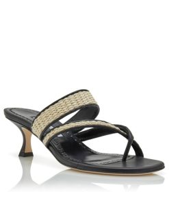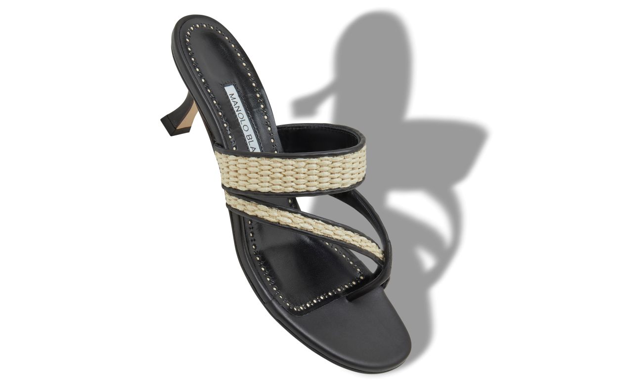 Black raffia open toe sandals featuring crossover front straps with toe stem, instep strap and beige nappa leather edging details. Finished with stiletto low heel.Upper: 95% raffia, 5% lamb nappa. Sole: 100% calf leather. Lining: 100% kid leather. Heel measures 50 mm. Italian sizing. Made in Italy.