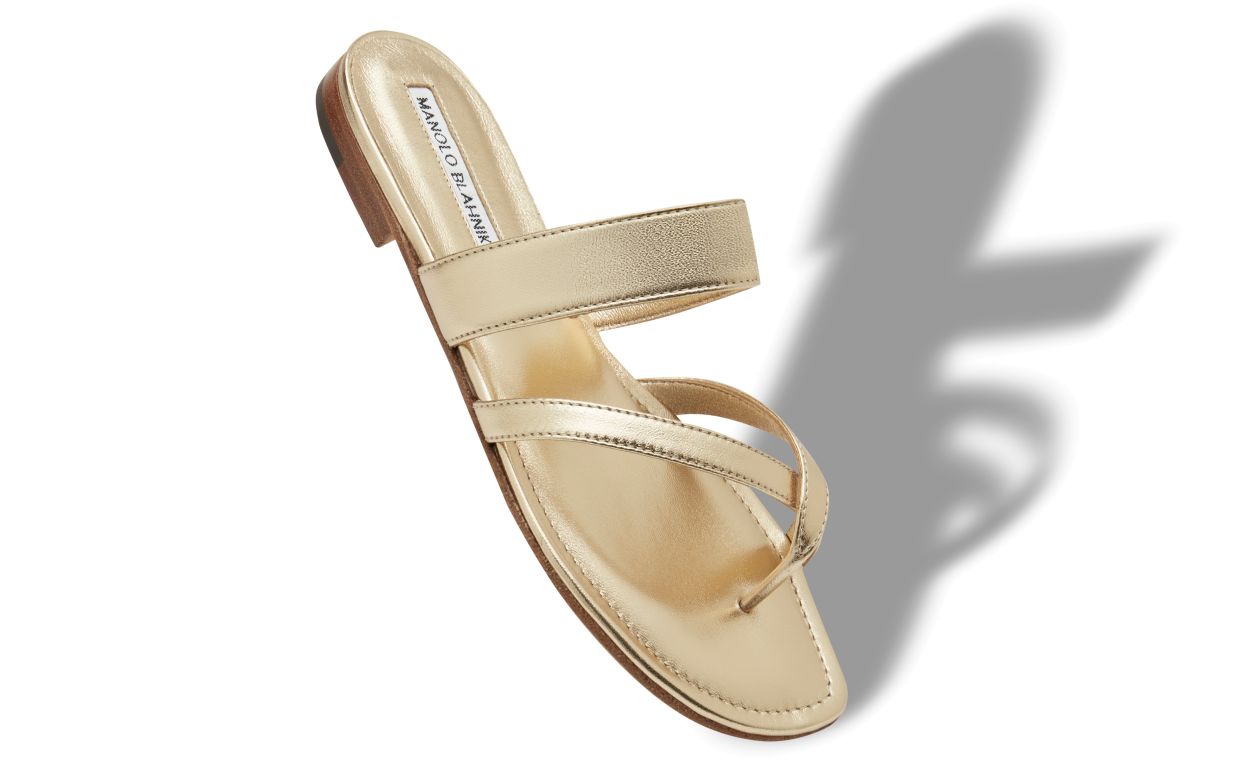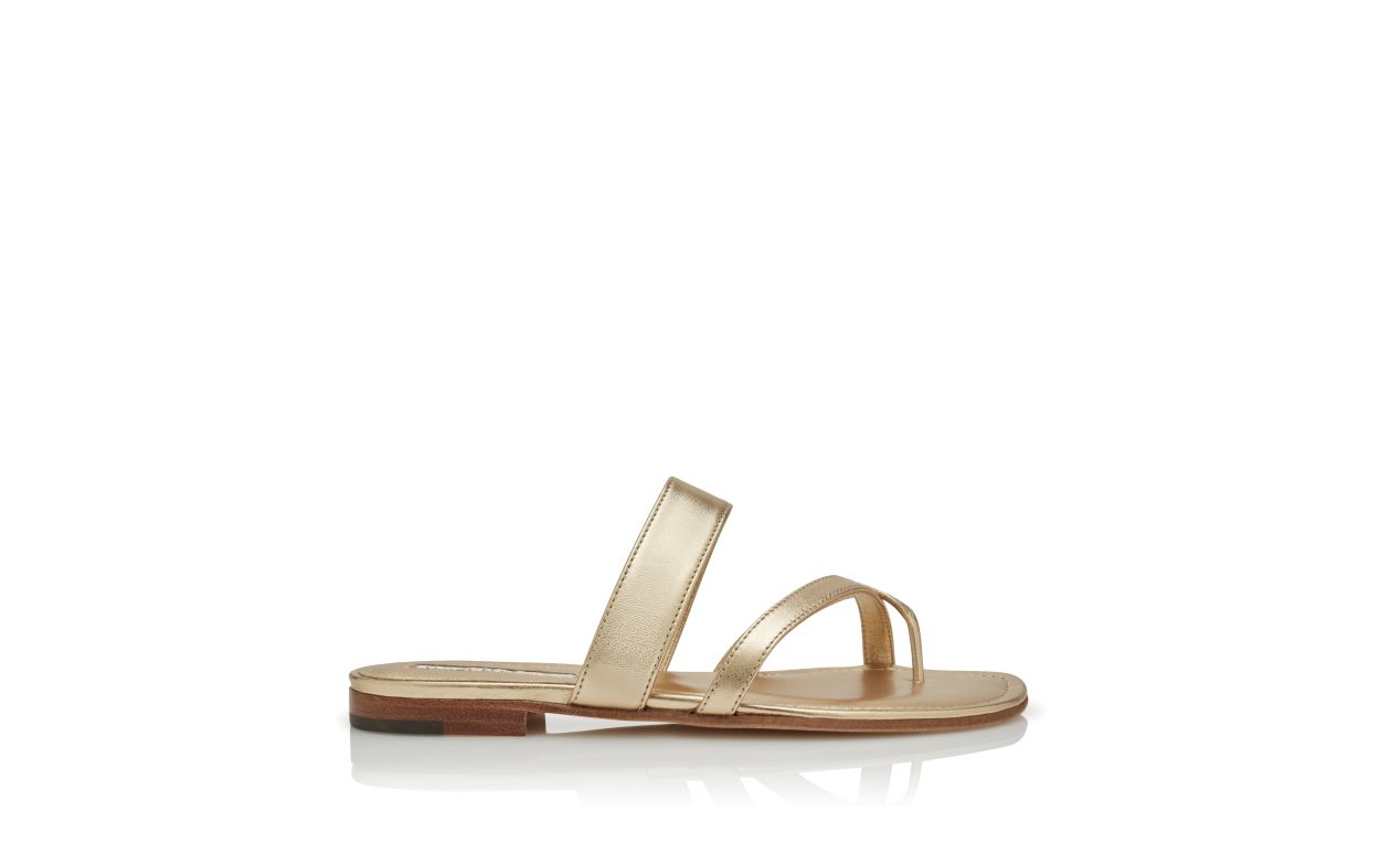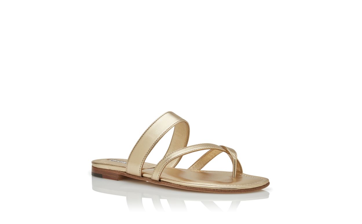 Gold nappa leather open toe flat sandals featuring crossover front straps with toe stem, instep strap and flat stacked heel. Upper: 100% lamb nappa. Sole: 100% calf leather. Lining: 100% kid leather. Heel measures 10 mm. Italian sizing. Made in Italy.