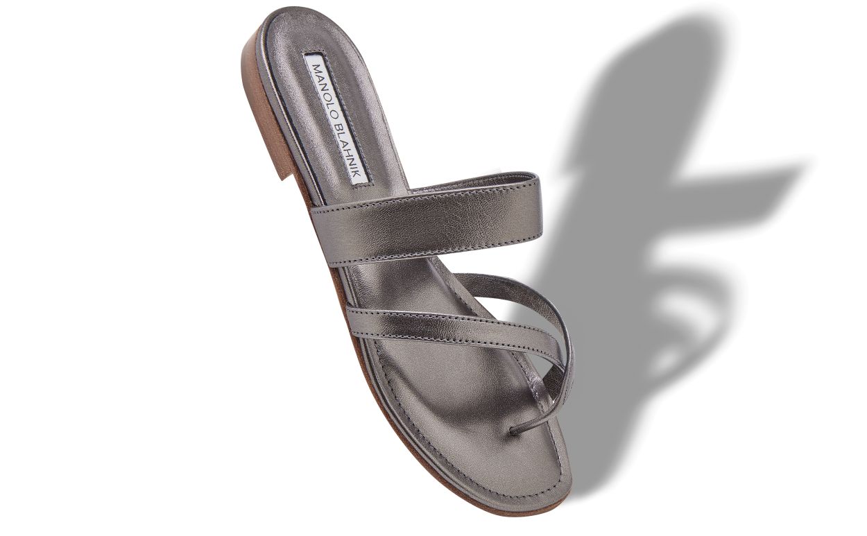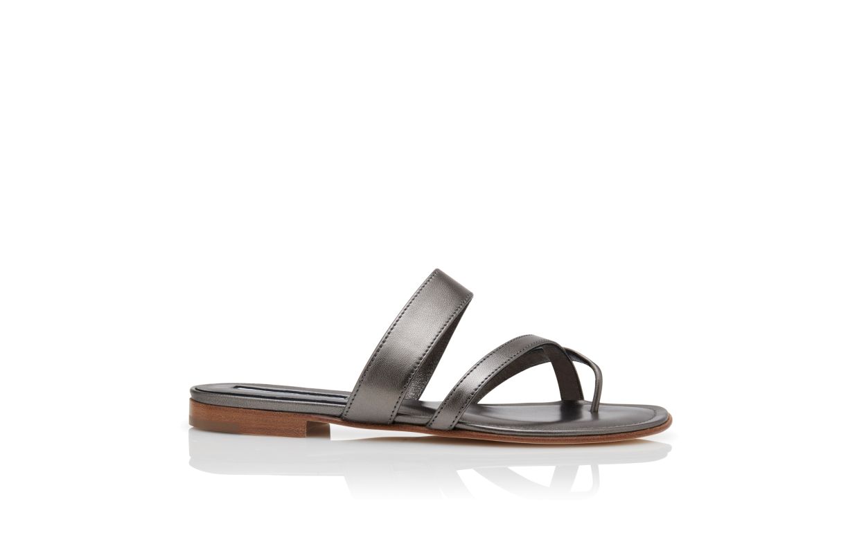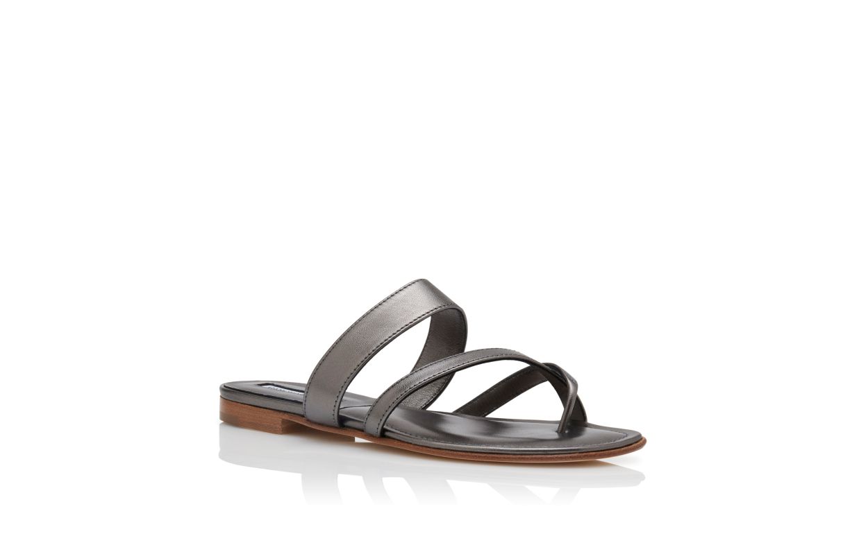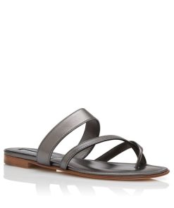 Graphite nappa leather open toe flat sandals featuring crossover straps with toe stem, instep strap and flat stacked heel.Upper: 100% lamb nappa. Sole: 100% calf leather. Lining: 100% kid leather.Heel measures 10 mm.Italian sizing.Made in Italy.