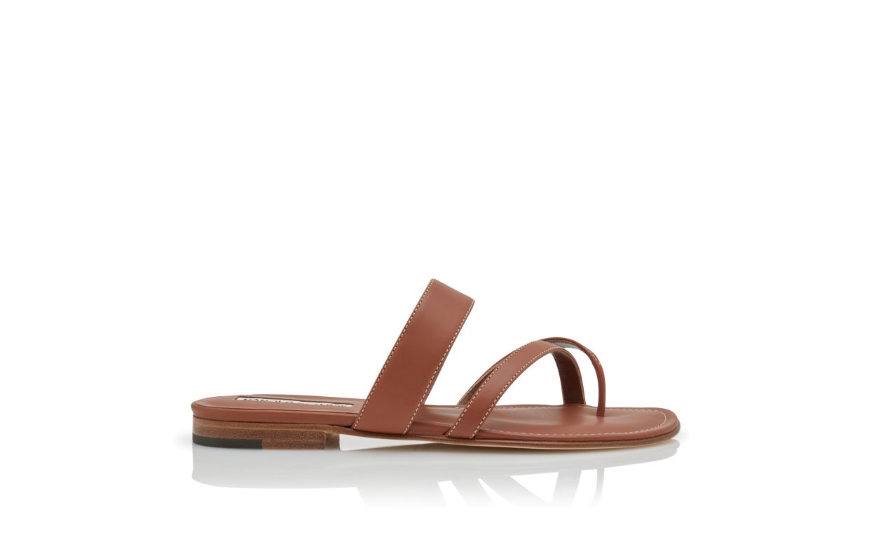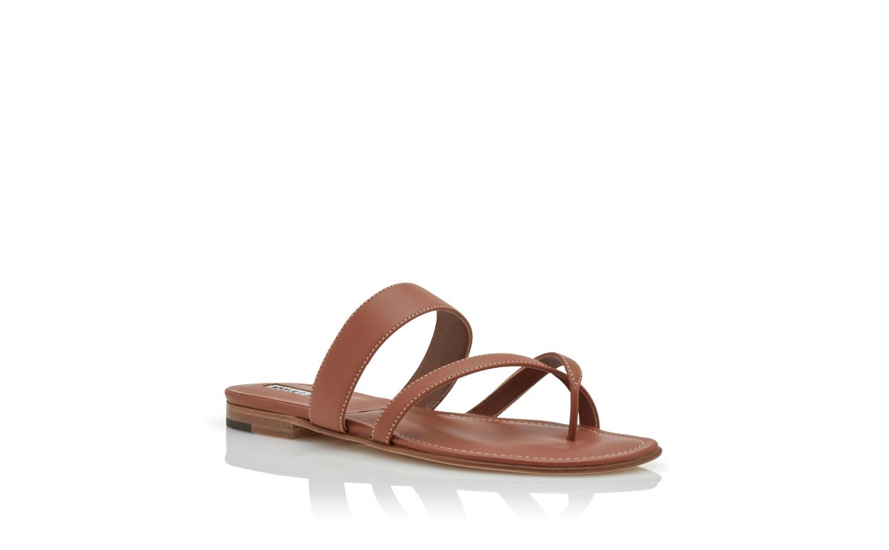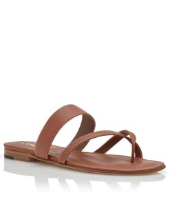 Brown calf leather open toe flat sandals featuring crossover straps with contrast stitching and flat stacked heel.Upper: 100% calf leather. Sole: 100% calf leather. Lining: 100% kid leather. Heel measures 10 mm.Italian sizing.Made in Italy.