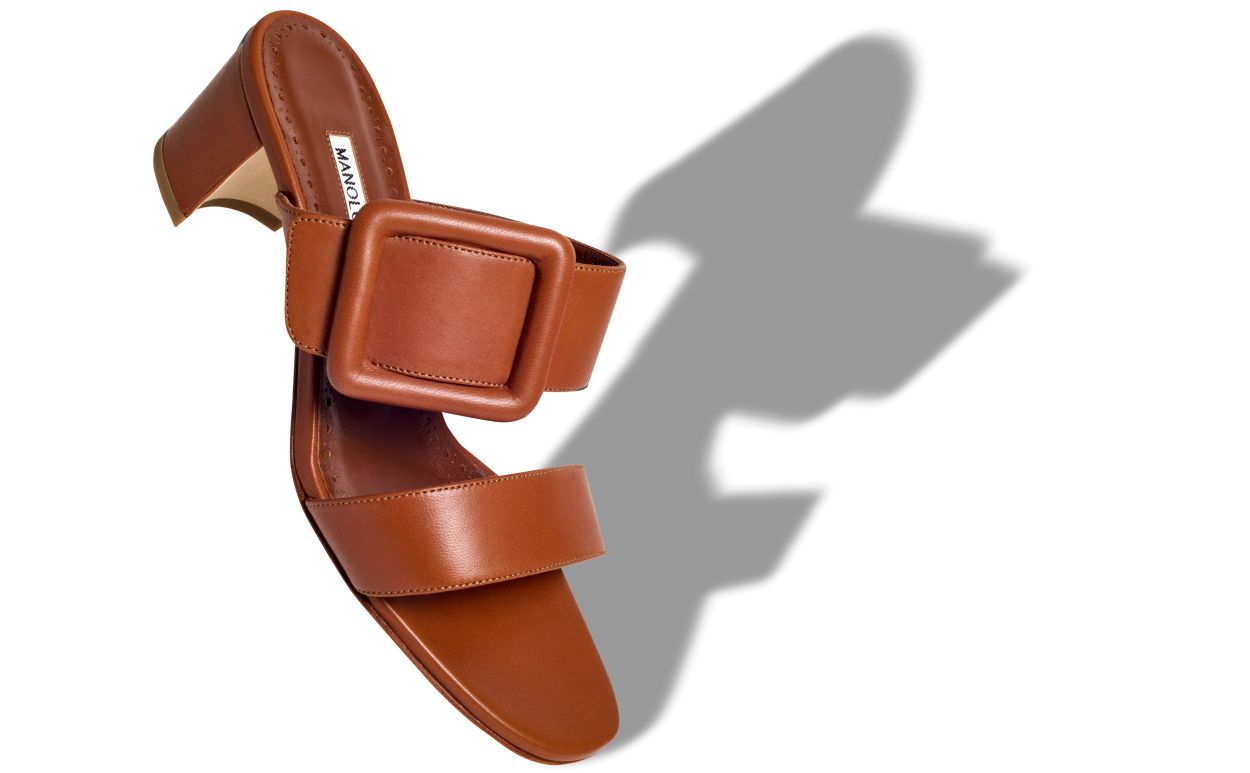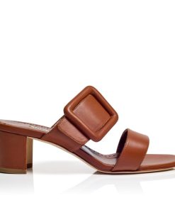 Brown nappa leather open toe mules featuring decorative buckle detail and finished with mid block heel.Upper: 100% lamb nappa. Sole: 100% calf leather.Lining: 100% kid leather. Heel measures 50 mm. Italian sizing. Made in Italy.