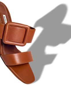 Brown nappa leather open toe mules featuring decorative buckle detail and finished with mid block heel.Upper: 100% lamb nappa. Sole: 100% calf leather.Lining: 100% kid leather. Heel measures 50 mm. Italian sizing. Made in Italy.