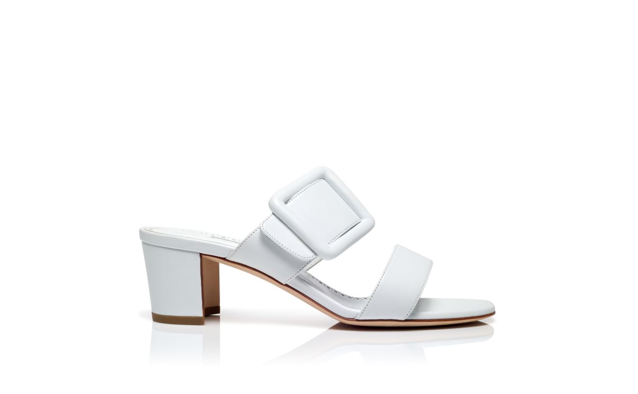 White nappa leather open toe mules featuring decorative buckle detail and finished with mid block heel.Upper: 100% lamb nappa. Sole: 100% calf leather.Lining: 100% kid leather. Heel measures 50 mm. Italian sizing. Made in Italy.