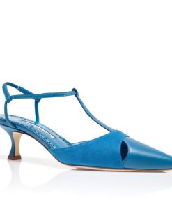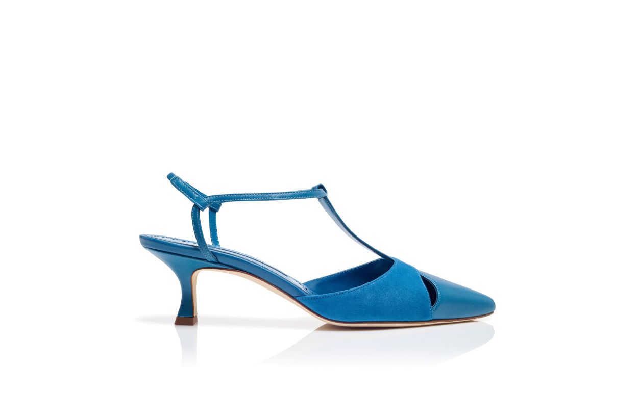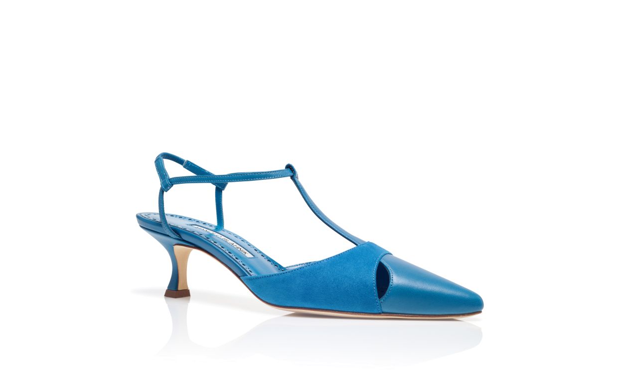 Blue nappa leather pointed toe pumps featuring cut-out details, T-Bar design and ankle strap closure. Finished with stiletto low heel.Upper: 80% lamb nappa, 20% kid suede. Sole: 100% calf leather. Lining: 100% kid leather.Heel measures 50 mm.Italian sizing.Made in Italy.