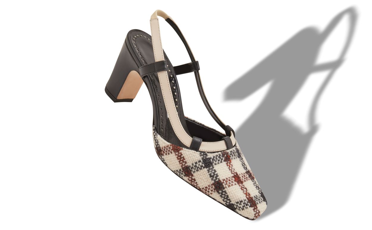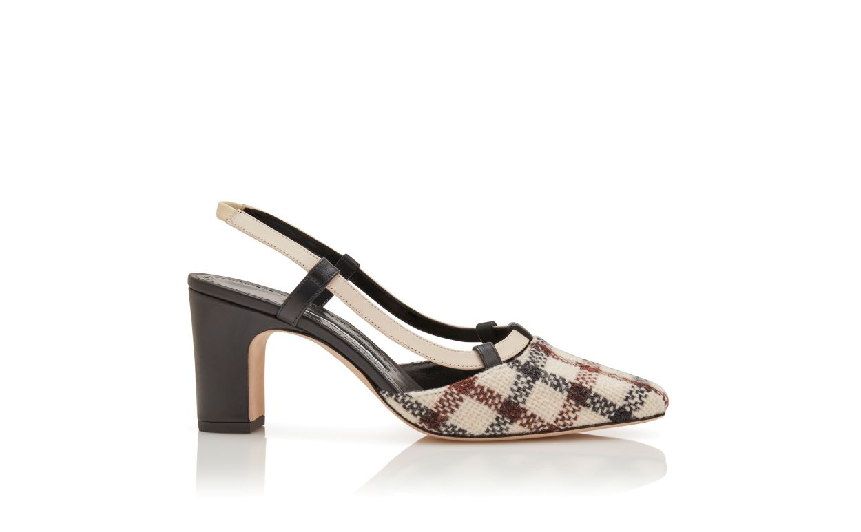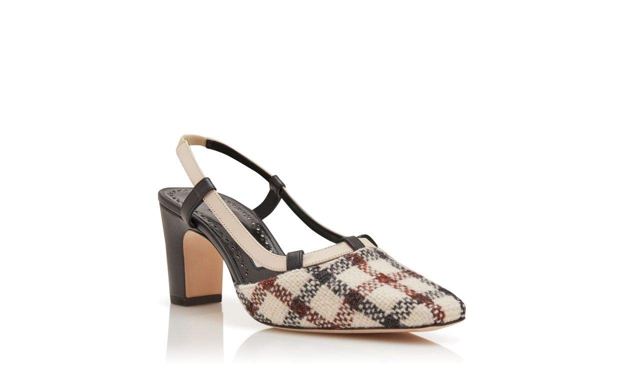 Light beige wool round toe pumps featuring cream calf leather elasticated slingback design, tartan toe cap and block mid heel.